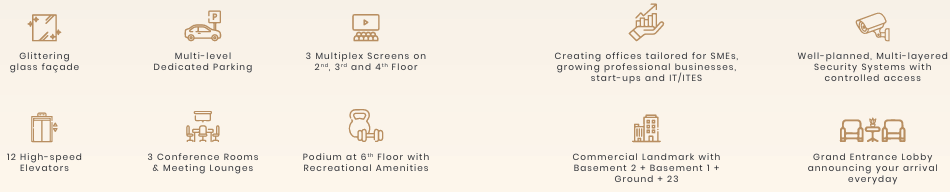 Amenities: Grand lobby, high-speed elevators, cafeteria, conference rooms, gym, podium amenities, multi-level parking & more